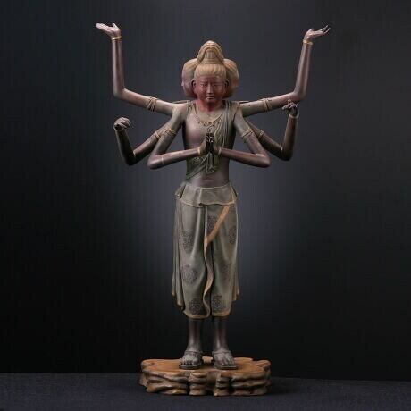 型番:KD018 研ぎ澄まされた究極の美 緻密な計算と徹底的な観察によって生み出された究極の「阿修羅像」 阿修羅像といえば憂いを帯びた少年のような姿が特徴である。ただ凛としているだけではなく、どこか頼りなさげで中性的、そんな阿修羅像本来が持つ神秘的な雰囲気をそのまま表現した。 まぶたの薄さや目の造形にもこだわり、実物同様に微妙な角度や光の当たり具合で変わる表情を再現している。 また指の位置は本物の阿修羅像をそのまま再現することにこだわり、針金が露出したり欠損している「ありのままの姿」で造形している。 フィギュアの域を超え、造形師が文字通り心身込めて作り上げた阿修羅像であるといえる。 ■阿修羅とは? 古代インドのアスラが仏教に取り入れられた、仏法を守護する八部衆に属する守護神。 仏法の守護者が戦いの神へと変わっていったのは、いずれ帝釈天に嫁がせたいと思っていた阿修羅の娘を阿修羅には舎脂(しゃし)という娘を帝釈天は舎脂を力ずくで奪ってしまい、 それに怒った阿修羅が帝釈天に戦いを挑むことになったことに起因するという言い伝えがある。 帝釈天は配下の四天王などや三十三天の軍勢も遣わせて応戦しやがて天界を追われ、人間界と餓鬼界の間に修羅界が加えられたともいわれる。 このように争いの耐えない状況を「修羅場」と呼ぶようになった語源にもなっている。 【各部名称】 ○三面六臂(腕の名称) 第一手(前で合掌) 第二手(左右に開いて手のひらを天に向けてる) 第三手(手前向き) 正面の顔:仏の教えに出会った瞬間(驚きと嬉しさのまじった表情) 左側の顔:今までの自分を後悔している姿 又は 過ちを認めきれない姿(唇をかみしめている表情) 右側の顔:人間界を哀れんでいる姿 又は 懺悔(ざんげ)をしている姿(悲しげな表情) 洲浜座(すはまざ)という海岸の波土際を思わせる台座に立ち、板金剛(いたこんごう)と呼ばれる草履を履いている。 衣の模様は宝相華(ほうそうげ)という空想上の植物で、牡丹や蓮などの植物を部分的に取り入れ、唐草風に表現し、吉祥の花、文様として扱われている。 【造形師】 木下隆志(海洋堂) 1988年、ガレージキット黎明期を経てメーカーとして確立した海洋堂に造形師として参加。 以来30年間、海洋堂所属の造形スタッフとして第一線で活躍する。 実物 と見間違えるほどリアルな造形を得意とし、ウルトラマンなどのキャラクターから昆虫や恐竜など幅広いフィギュアの原型製作を手掛けている。 近年では海洋堂 が企画するカプセルトイシリーズ「カプセルQミュージアム」でメイン造形師として活躍している。 サイズ 全高:約400mm
